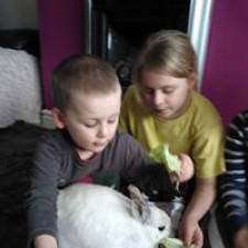 On occassion my own pair of cheeky monkey's Charlotte and Harry help to handle and tame the animals by having a party in our own living room.  Here they are feeding one of our many rabbits Issie which they seem quite keen on, still no joy on getting them to do any mucking out though!